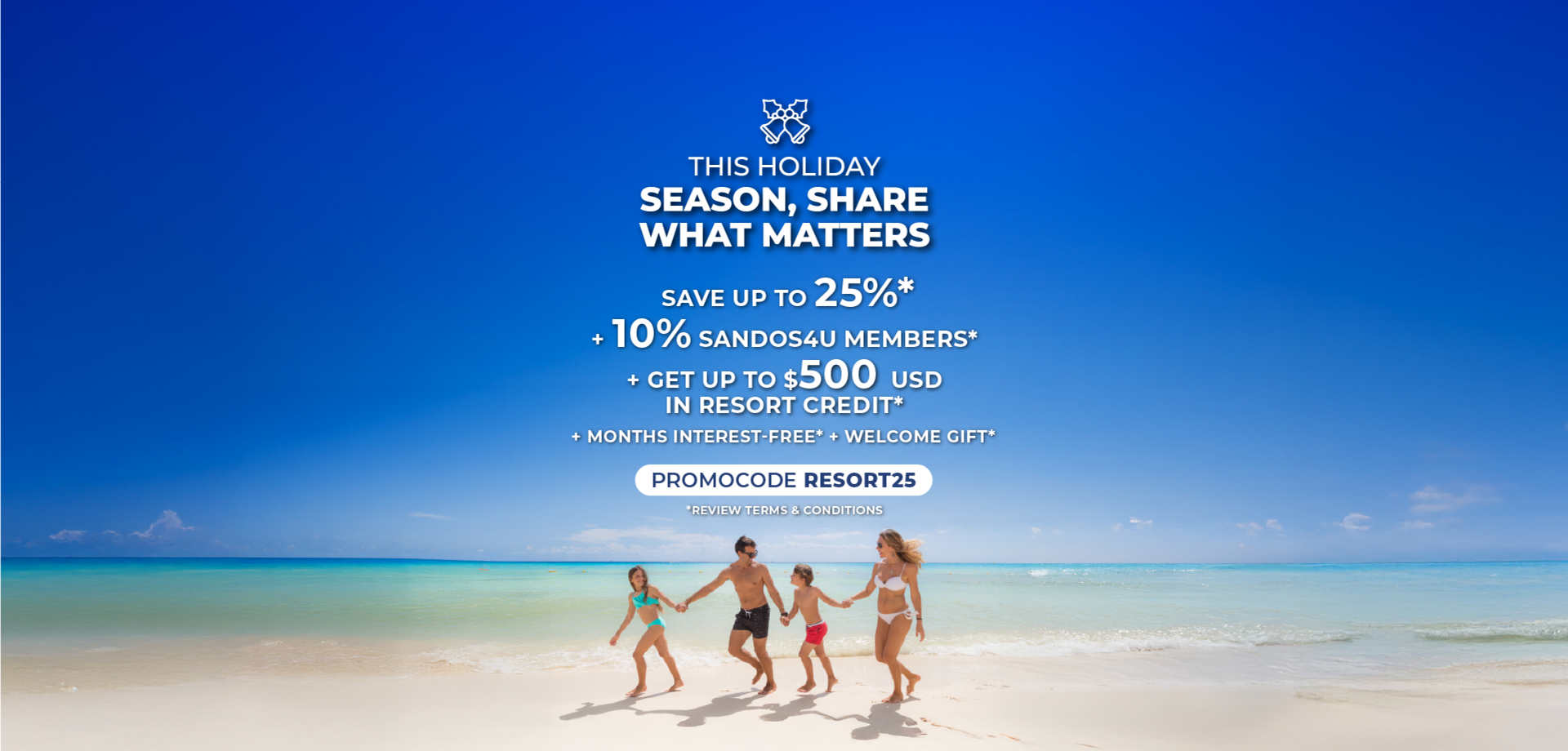 SAVE UP TO 25% + 10% OFF SANDOS4U MEMBERS + GET UP TO $500 USD RESORT CREDIT + MONTHS INTEREST FREE + WELCOME GIFT.