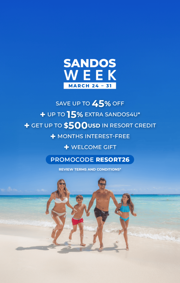 Sandos Week brings the perfect combination of fun and luxury by the sea. Book now through March 31st, enjoy up to 45% off, plus an extra 15% with Sandos4u, get up to $500 USD Resort Credit, and welcome gift use the promocode RESORT26. Travel between March 24th, 2026 and December 31st, 2027 and make unforgettable memories in the Riviera Maya.